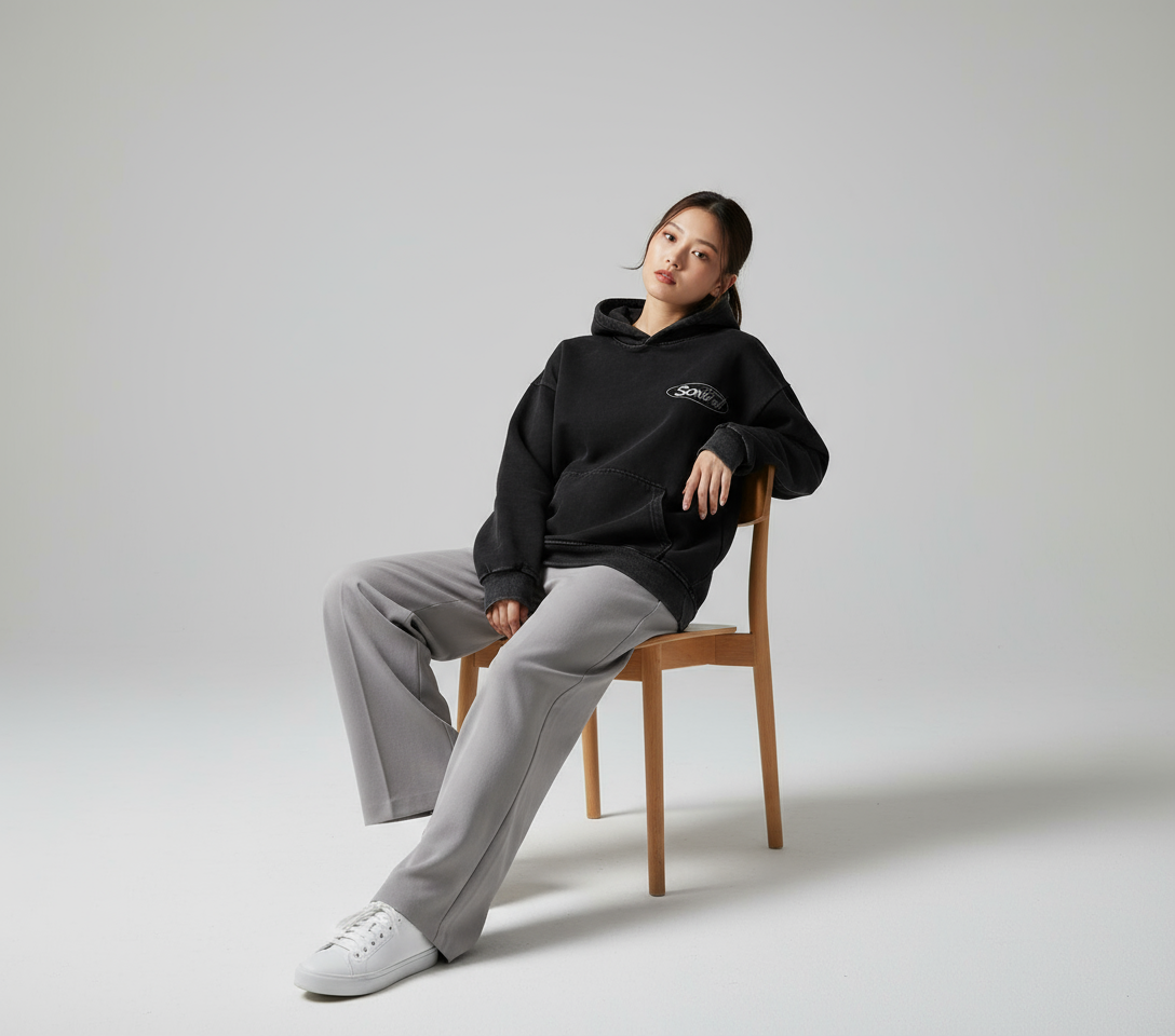 Boxy cropped hoodie with a relaxed, oversized fit and dropped shoulders that create an effortless streetwear silhouette. Slightly widened sleeves add movement, while ribbed cuffs and waistband provide structure and durability. Made from mid-weight 100% cotton French Terry, it has a soft yet firm texture that’s comfortable for everyday wear. Designed with a clean, drawstring-free double-layered hood and a centered kangaroo pocket.